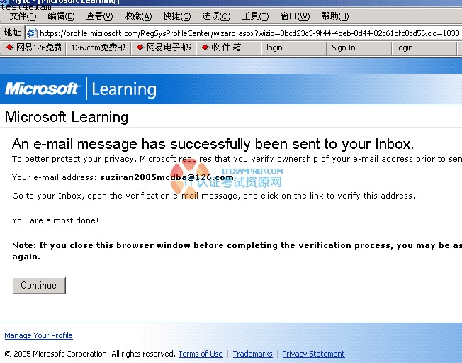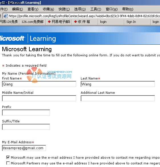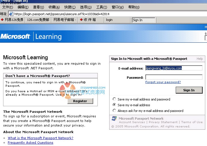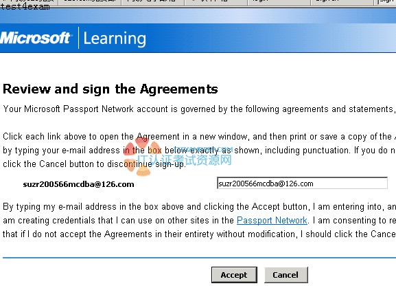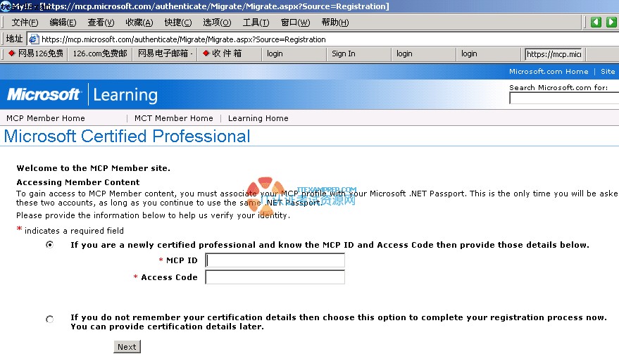 此时,你有了.NET PASSPORT信箱,和登录密码,以及MCP ID ,ACCESS CODE,就可以注册微软了。据IT认证考试资源网介绍认证考试通过后,微软会对你注册的邮箱发送包含你MCP ID和MCP ACCESS CODE的邮件,用来在线管理你的信息。