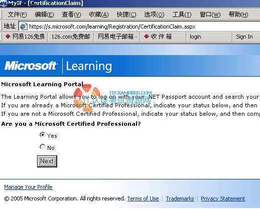 此时,会出现问你是不是微软MCP的选项,如果你已经考试过了微软任何科目,请选择 YES ,否则 ,选择 NO。