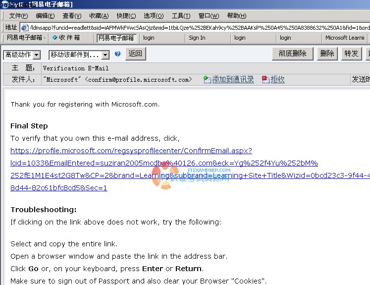 选择后,微软会向你的邮箱里面发一封确认信,此时,打开你的收信箱,点击里面的确认地址。即可以把你的邮箱正式注册成微软的 .NET Passport信箱了。![]()