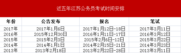 对于江苏公务员考试的时间,从2016年、2017年两年时间安排可以初见端倪,因为笔试变革使公告发布和报名时间提前外,其他时间均无太大变化。而结合历年江苏省考的时间安排及2017年江苏公务员考试公告发布及报名时间提前的原因,预计2018年江苏公务员考试还是有很大可能在2018年1月份启动报名,3月份笔试。虽然现在距离2018年江苏公务员考试还有大半年的时间,但是为了复习达到更好的效果,建议考生为自己制定一个合理的复习计划,对接下来的复习有所帮助。