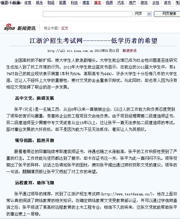 新浪报道我们网站为成为低学历希望新闻。如图: