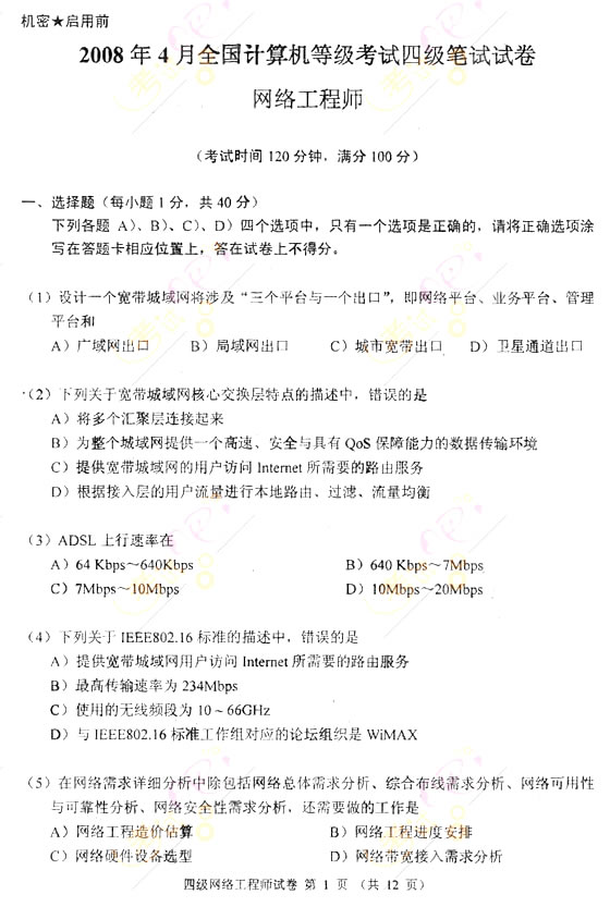 2008年4月全国计算机等级考试四级网络工程师笔试试题